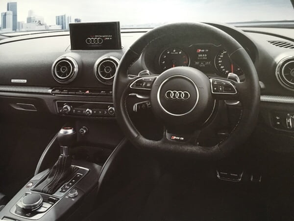 ステアリングホイールやシフトノブに印されているのは、存在感のあるRS3のロゴ。