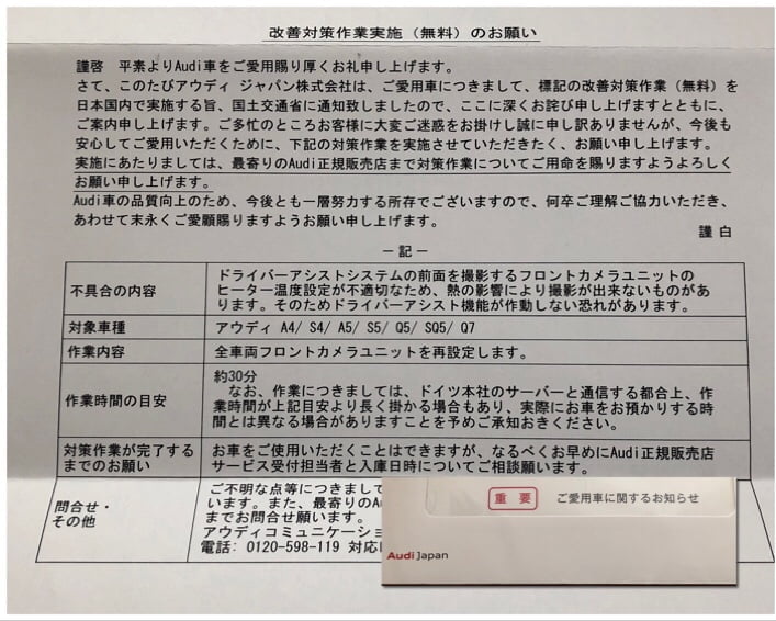 この記事を書いている現在、既にAudiからDMが届いており、そこには「修理をするからお世話になっているディーラーでやってもらってね」と書かれています。