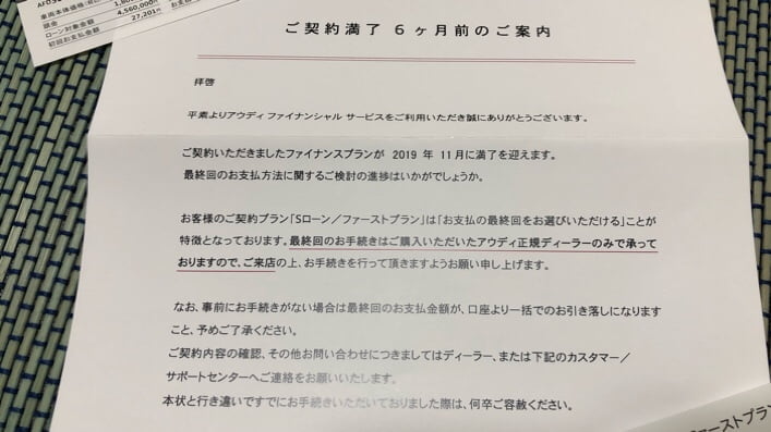 ウチのA4 Avantは残価設定型のローンを組んでいますので、契約終了後どうするかは3つの選択肢があったはずです。